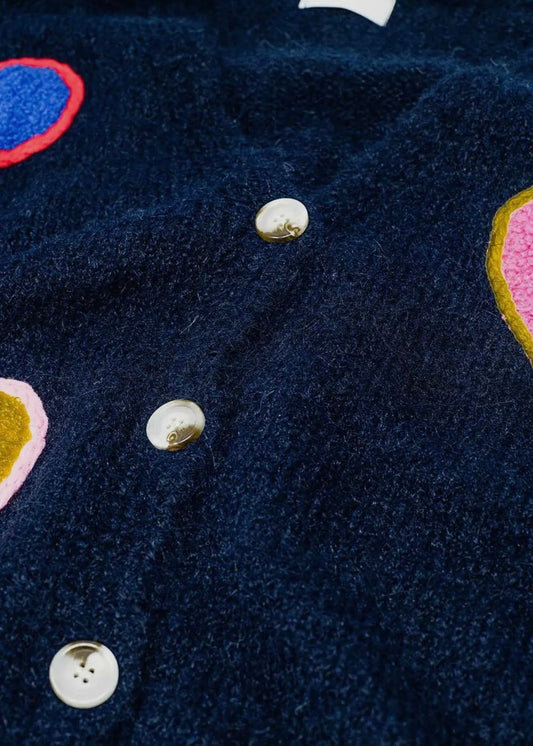 Q2 Blue Knitted Cardigan With Embroidered Hearts