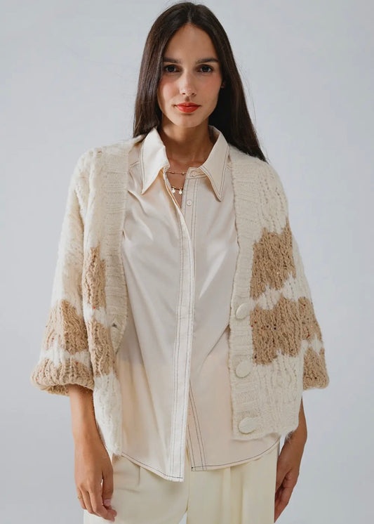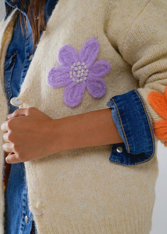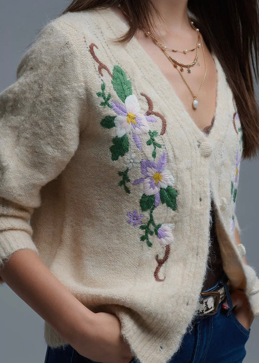 Q2 Cable Knit Beige Cardigan With Embroidered Flowers