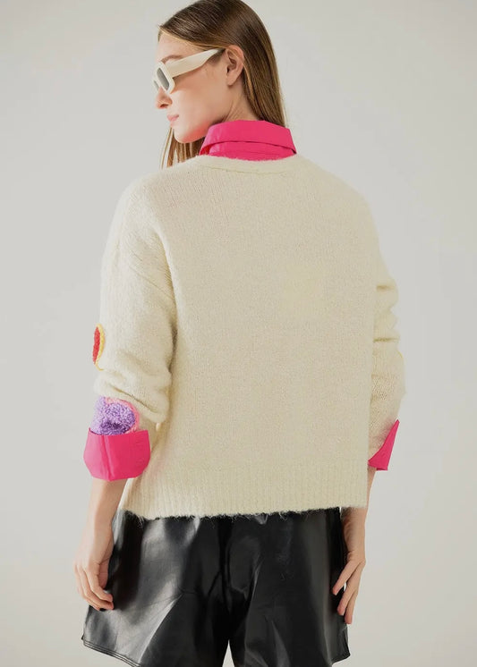 Q2 Beige Knitted Cardigan With Embroidered Hearts