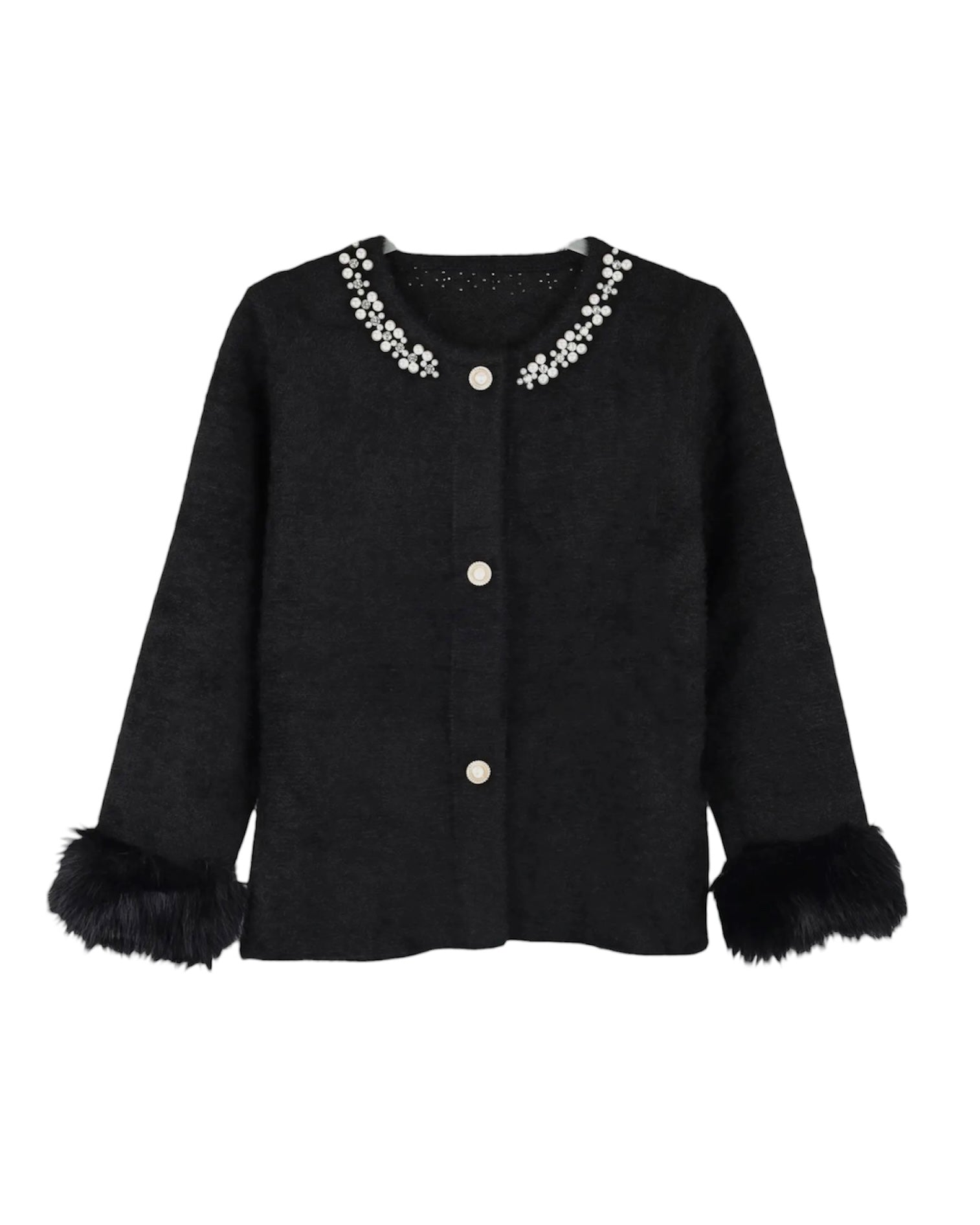 Faux Fur Cuff And Embellished Neck Cardi In Black